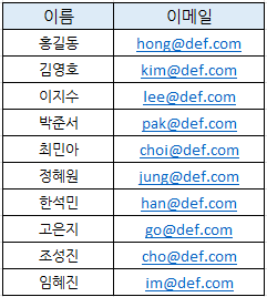 아래와 같이 이름과 이메일로 A, B열에 리스트 되어 있어야 합니다.